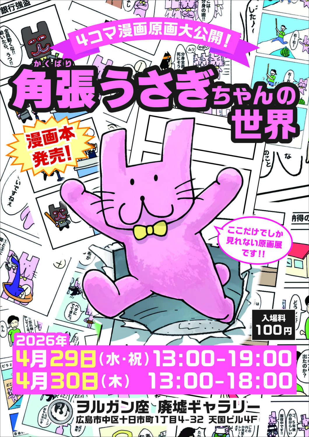 ついに漫画本になりました!本展では、ここでしか見られない4コマ原画の展示をはじめ、かくばったうさぎ「角張うさぎちゃん」の誕生秘話や、4コマ制作についてのセルフインタビューをパネル展示でご紹介します。